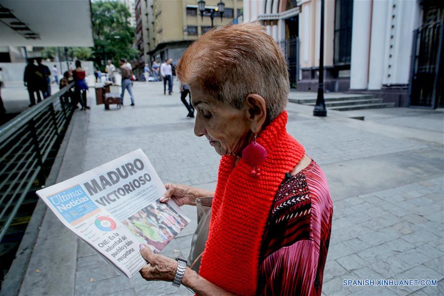 Una mujer lee el periódico en la Plaza Lina Ron, en Caracas, Venezuela, el 21 de mayo de 2018. Resultados de los comicios del domingo en Venezuela son un reflejo de la voluntad popular, afirmó el lunes la misión de acompa?amiento internacional del Consejo de Expertos Electorales de Latinoamérica (Ceela). En rueda de prensa desde la sede del Poder Electoral tras la presentación del informe técnico del Ceela ante el CNE, el titular del Ceela, Nicanor Moscoso dijo que el proceso electoral "se realizó de manera exitosa y que la voluntad de los ciudadanos, libremente expresada en las urnas, se respetó". (Xinhua/Boris Vergara)