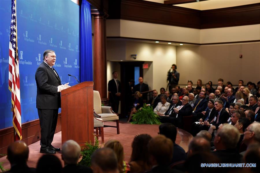 El secretario de Estado estadounidense, Mike Pompeo (i), pronuncia un discurso sobre la política estadounidense después de retirarse del acuerdo nuclear de Irán, en la Fundación Heritage, en Washington D.C., Estados Unidos, el 21 de mayo de 2018. El secretario de Estado de Estados Unidos, Mike Pompeo, dijo el lunes en Washington que Irán sufrirá las sanciones más duras de la historia de parte de Estados Unidos si no cambia el curso actual. En un discurso pronunciado en la Fundación Heritage de Estados Unidos, un grupo de consultoría conservador, para presentar una nueva estrategia de Estados Unidos sobre Irán, Pompeo urgió a Teherán a que reporte al Organismo Internacional de Energía Atómica sobre su programa nuclear, ponga fin a la proliferación de sus misiles y deje de apoyar a "grupos terroristas" en el Medio Oriente. (Xinhua/Yang Chenglin)