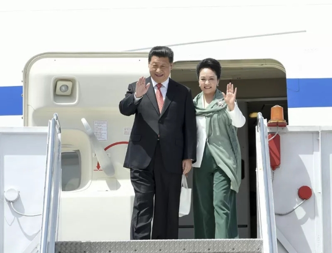 Xi Jinping y Peng Liyuan saludan al público después de llegar al aeropuerto de Islamabad para una visita de Estado a Pakistán, el 20 de abril de 2015. [Foto / Xinhua]