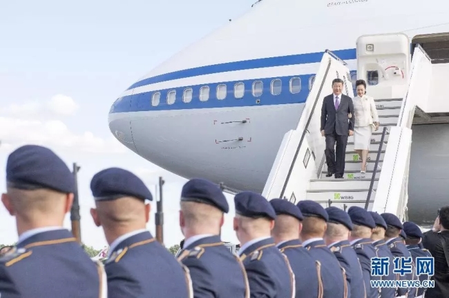Xi Jinping y Peng Liyuan en el aeropuerto de Berlín, Alemania, el 4 de julio de 2017. [Foto / Xinhua]