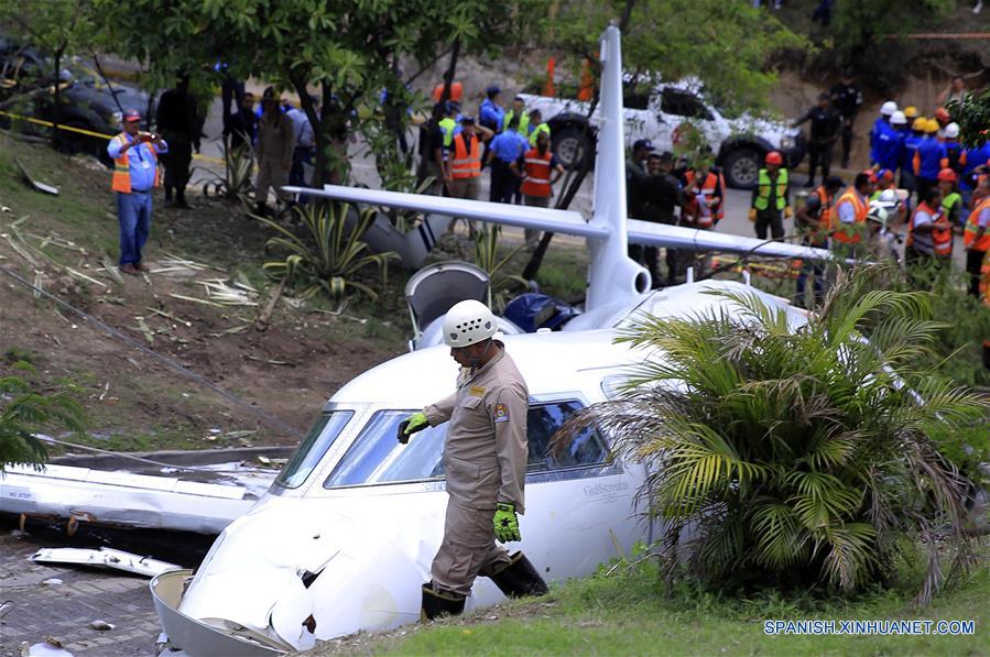 Rescatistas trabajan en el área donde un avión se accidentó, en Tegucigalpa, capital de Honduras, el 22 de mayo de 2018. El portavoz del Hospital Escuela de Tegucigalpa, Miguel Osorio, informó el martes que las seis personas que se accidentaron en el aeropuerto Toncontín de Tegucigalpa, se encuentran fuera de peligro. Las seis personas se transportaban en un avión privado procedente de Estados Unidos, que se salió de la pista del aeropuerto Toncontín y cayó sobre una concurrida carretera. La aeronave con matrícula estadounidense N813WM llegó a Honduras desde Austin, Texas, Estados Unidos. (Xinhua/Rafael Ochoa)