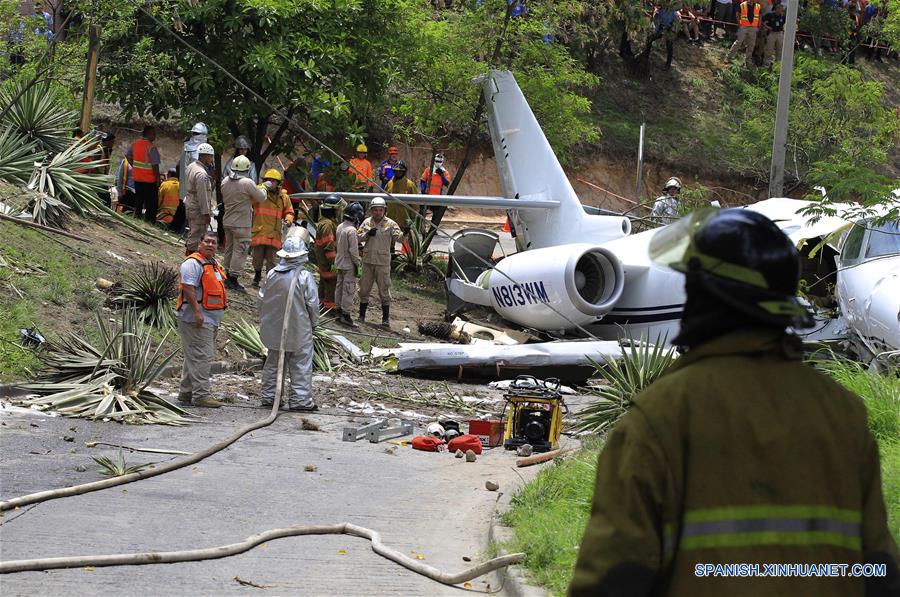 Rescatistas trabajan en el sitio donde un avión se accidentó, en Tegucigalpa, capital de Honduras, el 22 de mayo de 2018. El portavoz del Hospital Escuela de Tegucigalpa, Miguel Osorio, informó el martes que las seis personas que se accidentaron en el aeropuerto Toncontín de Tegucigalpa, se encuentran fuera de peligro. Las seis personas se transportaban en un avión privado procedente de Estados Unidos, que se salió de la pista del aeropuerto Toncontín y cayó sobre una concurrida carretera. La aeronave con matrícula estadounidense N813WM llegó a Honduras desde Austin, Texas, Estados Unidos. (Xinhua/Rafael Ochoa)