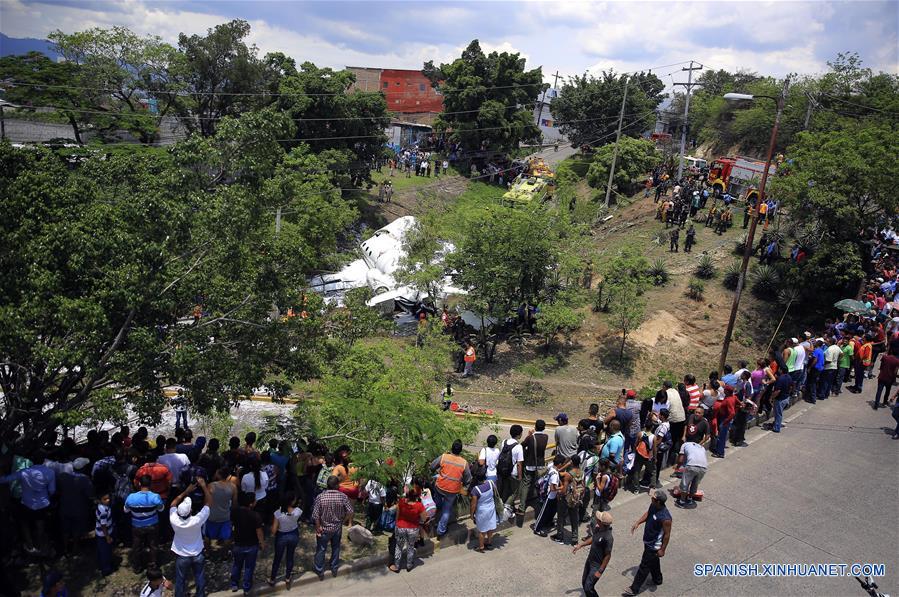 Personas se reúnen cerca del área donde un avión se accidentó, en Tegucigalpa, capital de Honduras, el 22 de mayo de 2018. El portavoz del Hospital Escuela de Tegucigalpa, Miguel Osorio, informó el martes que las seis personas que se accidentaron en el aeropuerto Toncontín de Tegucigalpa, se encuentran fuera de peligro. Las seis personas se transportaban en un avión privado procedente de Estados Unidos, que se salió de la pista del aeropuerto Toncontín y cayó sobre una concurrida carretera. La aeronave con matrícula estadounidense N813WM llegó a Honduras desde Austin, Texas, Estados Unidos. (Xinhua/Rafael Ochoa)