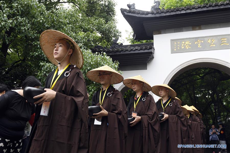 ZHEJIANG, mayo 22, 2018 (Xinhua) -- Monjes sostienen cuencos para reciben donaciones de manos de residentes y turistas, en Hangzhou, capital de la provincia de Zhejiang, en el este de China, el 22 de mayo de 2018. En total 1,000 monjes de Hangzhou participaron el martes en una caminata tradicional de mendicantes del Templo Faxi al Templo Lingyin para recabar donaciones. Todas las donaciones recibidas a lo largo del camino serán utilizadas para la caridad. (Xinhua/Huang Zongzhi)