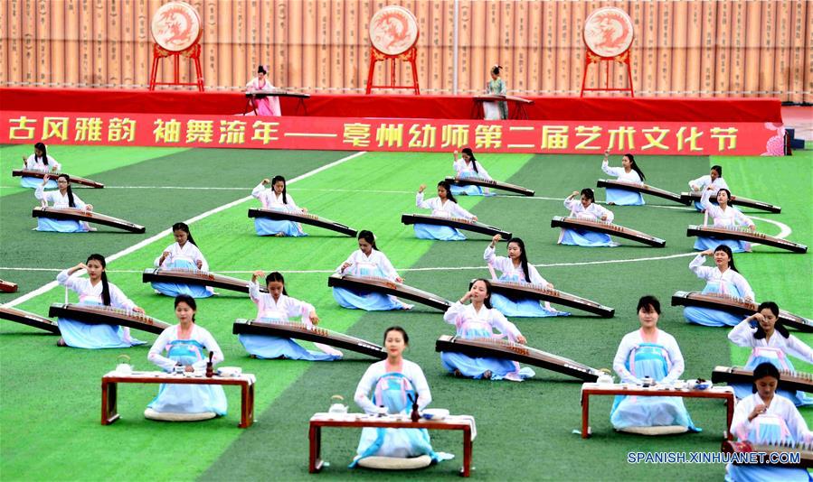 Estudiantes realizan una interpretación en el 2 Festival de Arte y Cultura llevado a cabo en la Escuela de Profesores de Jardín de Ni?os de Bozhou, en Bozhou, provincia de Anhui, en el este de China, el 22 de mayo de 2018. (Xinhua/Liu Qinli)