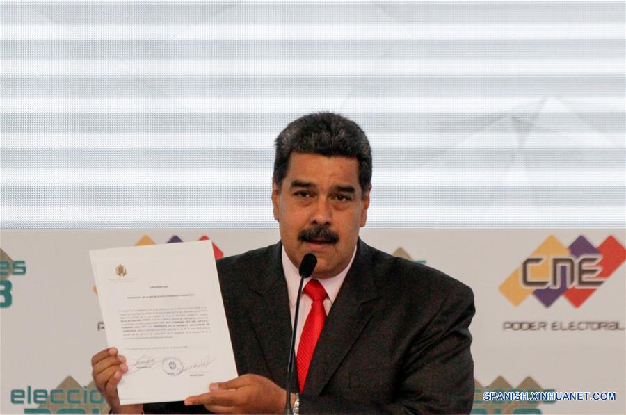 El presidente de Venezuela, Nicolás Maduro, pronuncia un discurso mientras sostiene el acta que lo declara como ganador de las elecciones presidenciales, durante el acto en el que es proclamado como presidente para el periodo 2019-2025, en la sede del CNE, en Caracas, Venezuela, el 22 de mayo de 2018. El Consejo Nacional Electoral (CNE) de Venezuela proclamó el martes a Nicolás Maduro como presidente reelecto con 6,224,040 votos, lo que representa el 67.81 por ciento de respaldo de votantes, en la elección presidencial realizada el domingo 20 de mayo. La presidenta del CNE, Tibisay Lucena, entregó a Maduro el acta de proclamación como presidente de Venezuela para un periodo de 6 a?os (2019 -2025). Con el 99.05 por ciento de actas transmitidas, lo que representa 9,368,035 votos escrutados y 46.08 por ciento de participación electoral, el CNE adjudicó la presidencia de Venezuela a Maduro. (Xinhua/Boris Vergara)