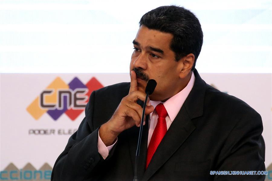 El presidente de Venezuela, Nicolás Maduro, reacciona durante el acto en el que es proclamado como presidente para el periodo 2019-2025, en la sede del Consejo Nacional Electoral (CNE), en Caracas, Venezuela, el 22 de mayo de 2018. El Consejo Nacional Electoral (CNE) de Venezuela proclamó el martes a Nicolás Maduro como presidente reelecto con 6,224,040 votos, lo que representa el 67.81 por ciento de respaldo de votantes, en la elección presidencial realizada el domingo 20 de mayo. La presidenta del CNE, Tibisay Lucena, entregó a Maduro el acta de proclamación como presidente de Venezuela para un periodo de 6 a?os (2019 -2025). Con el 99.05 por ciento de actas transmitidas, lo que representa 9,368,035 votos escrutados y 46.08 por ciento de participación electoral, el CNE adjudicó la presidencia de Venezuela a Maduro. (Xinhua/Zurimar Campos/AVN)