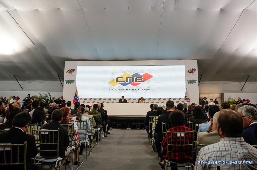 El presidente de Venezuela, Nicolás Maduro (i-atrás), asiste al acto en el que es proclamado como presidente para el periodo 2019-2025, en presencia de la presidenta del Consejo Nacional Electoral (CNE), Tibisay Lucena (d-atrás), en la sede del CNE, en Caracas, Venezuela, el 22 de mayo de 2018. (Xinhua/Boris Vergara)