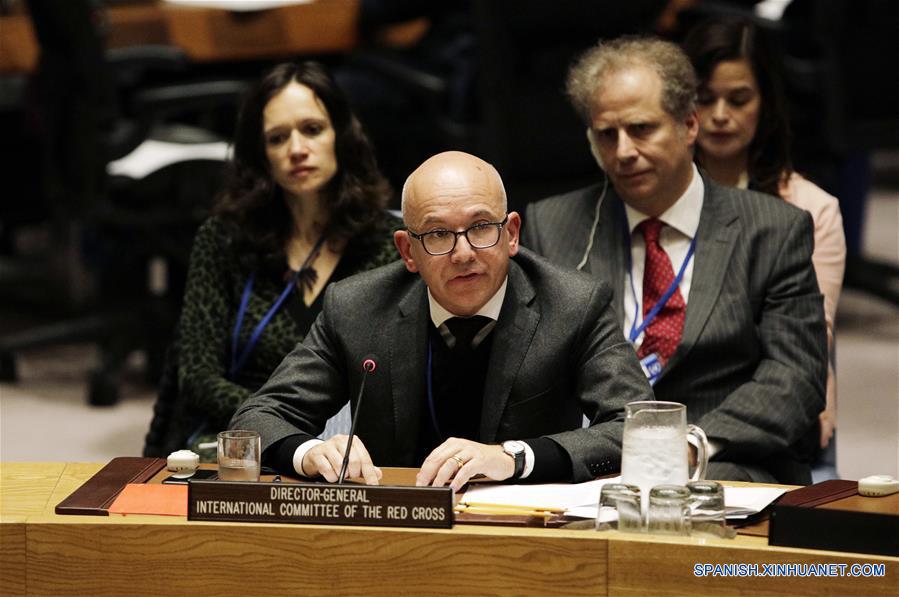 El director general del Comité Internacional de la Cruz Roja (ICRC, por sus siglas en inglés) (frente), asiste a una reunión del Consejo de Seguridad sobre la protección de civiles en conflictos armados, en la sede de la Organización de las Naciones Unidas (ONU), en Nueva York, Estados Unidos, el 22 de mayo de 2018. El secretario general de la ONU, António Guterres, dijo el martes que más de 128 millones de personas en todo el mundo necesitan ayuda humanitaria inmediata y que esta impresionante cifra se deriva sobre todo del conflicto. (Xinhua/Li Muzi)
