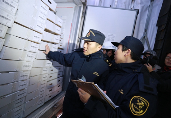 Los funcionarios de aduanas de Shanghái inspeccionan la carne importada de la UE.