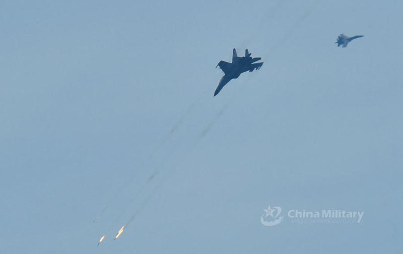 Dos cazas de la brigada de aviación de la flota del Mar del Sur de China de la Marina del Ejército Popular de Liberación, el 17 y 18 de mayo realizaron entrenamientos con fuego vivo en un polígono de tiro ubicado en el Mar del Sur de China. (Foto: eng.chinamil.com.cn)