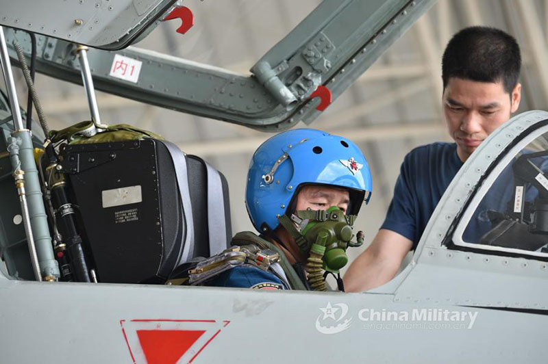 Un piloto asignado a brigada de aviación de la flota del Mar del Sur de China de la Marina del Ejército Popular de Liberación, ejecuta los procedimientos de preparación para el vuelo antes de comenzar los entrenamientos realizados el 17 y 18 de mayo con fuego vivo en un polígono de tiro ubicado en el Mar del Sur de China. (Foto: eng.chinamil.com.cn)