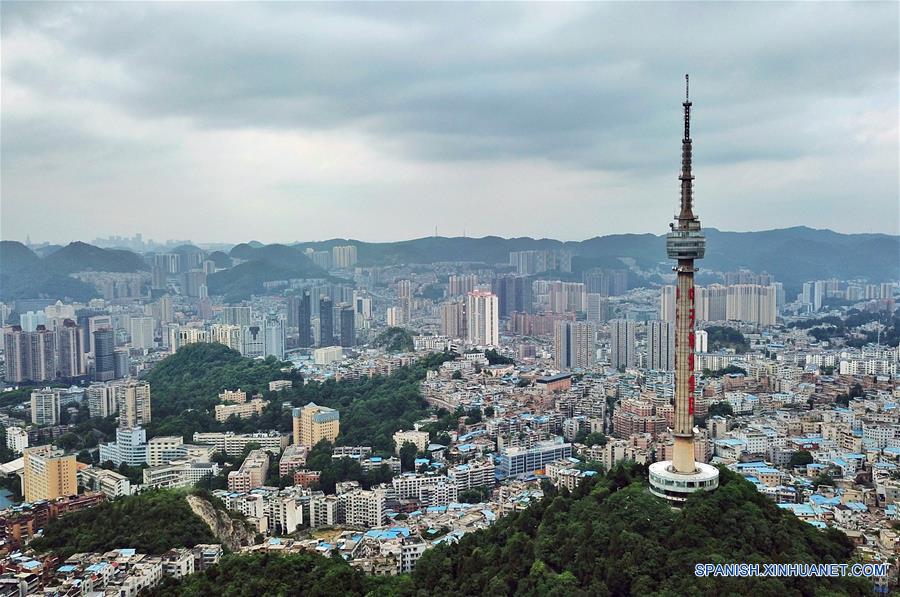 Imagen del 23 de mayo de 2018 de una vista aérea de una torre de televisión, en Guiyang, ciudad capital de la provincia de Guizhou, en el suroeste de China. (Xinhua/Ou Dongqu)