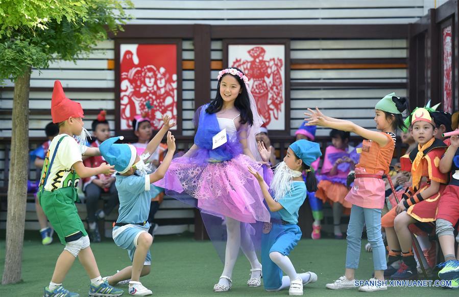 Estudiantes muestran ropa hecha con residuos, en la Escuela Primaria Calle Beixin en Shijiazhuang, capital de la provincia de Hebei, en el norte de China, el 23 de mayo de 2018. (Xinhua/Zhang Shuo)