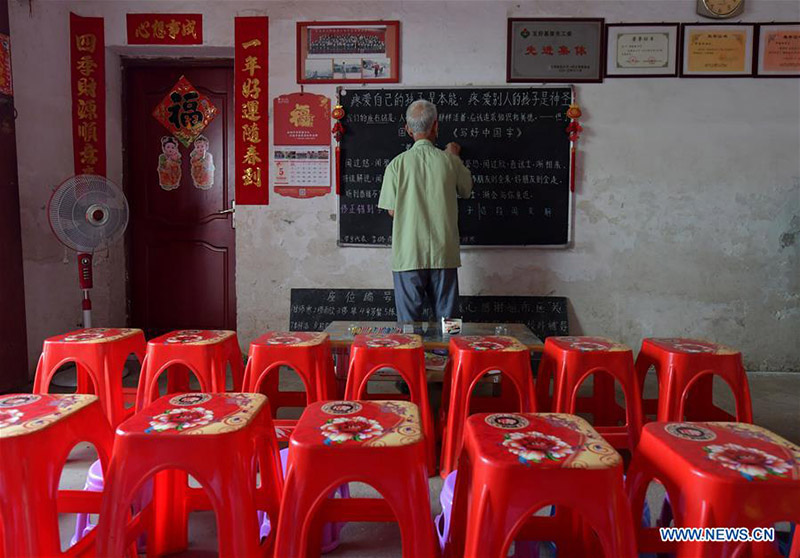 Miao escribe en la pizarra del local para el cuidado de los “ni?os dejados atrás”, creado en su casa de Shibu, Nanchang, provincia de Jiangxi, 23 de mayo del 2018. Miao, de 70 a?os, estableció en el 2009 un local para el cuidado de los “ni?os dejados atrás” donde ayuda gratis a los ni?os a realizar sus deberes y estudiar después del horario escolar. Durante los últimos nueve a?os, ha repasado a más de 3.000 ni?os. Miao se siente satisfecho cuando constata el progreso académico de los “ni?os dejados atrás”. [Foto: Xinhua]