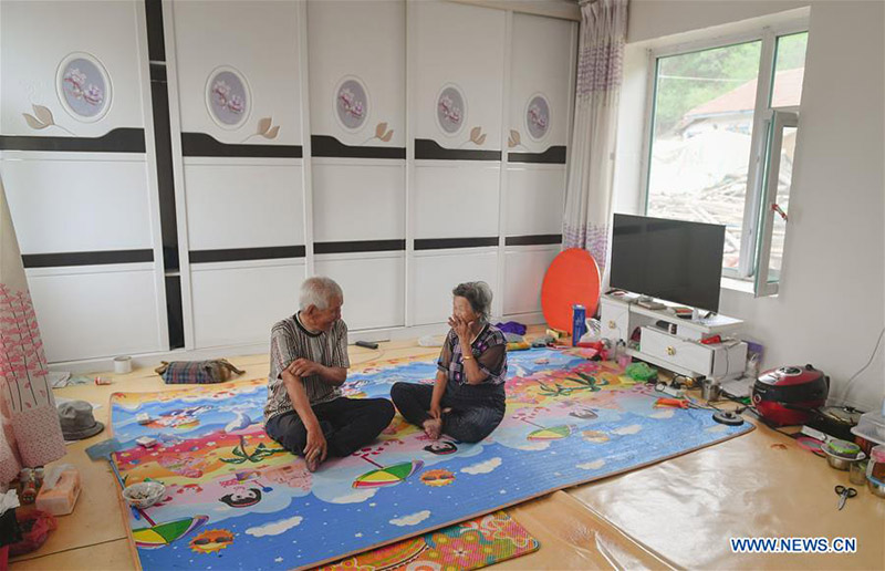 Liu Zailong charla con su esposa en su casa situada en la aldea Dongtai, en Wangqing, provincia de Jilin, 22 de mayo del 2018. Este octogenario campesino labora como apicultor para aumentar sus ingresos personales. Su aldea se ha planteado desarrollar la apicultura para reducir la pobreza. (Foto: Xinhua/ Xu Chang)