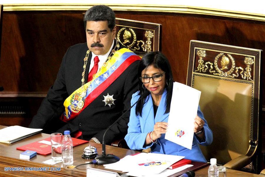 CARACAS, mayo 24, 2018 (Xinhua) -- El presidente venezolano, Nicolás Maduro (i), en presencia de la presidenta de la Asamblea Nacional Constituyente (ANC), Delcy Rodríguez (d), participa durante su acto de juramentación ante la ANC, en el Palacio Federal Legislativo, en Caracas, Venezuela, el 24 de mayo de 2018. (Xinhua/Pedro Mattey/AVN)