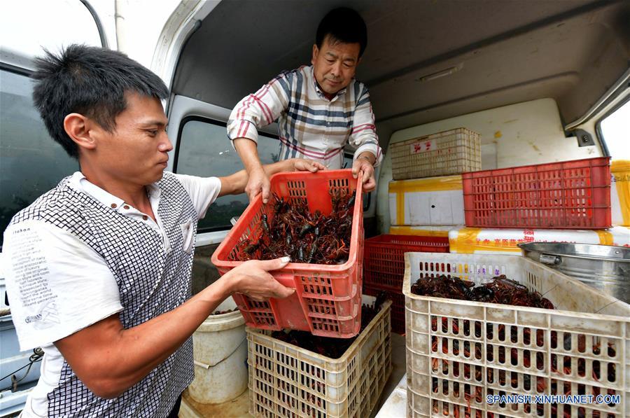 Residentes llevan una caja con cangrejos de río a un vehículo, en la villa de Helin del municipio de Xiangshan en Nanchang, provincia de Jiangxi, en el este de China, el 23 de mayo de 2018. China es el mayor productor de cangrejos de río del mundo, con un rendimiento anual que representa más del 70 por ciento del total mundial. (Xinhua/Peng Zhaozhi)