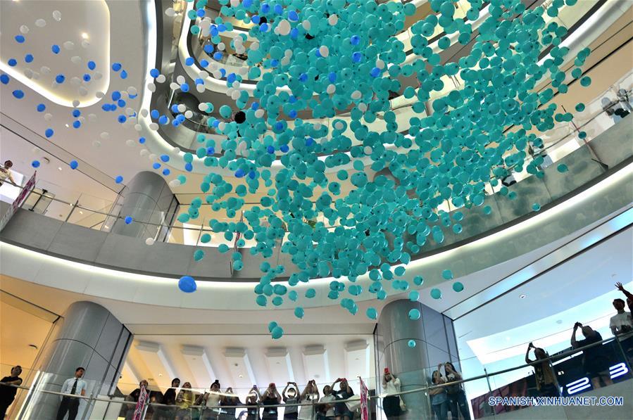 Imagen del 25 de mayo de 2018 de personas visitando una exposición de arte de globos, en Tianjin, en el norte de China. (Xinhua/Hu Lingyun)