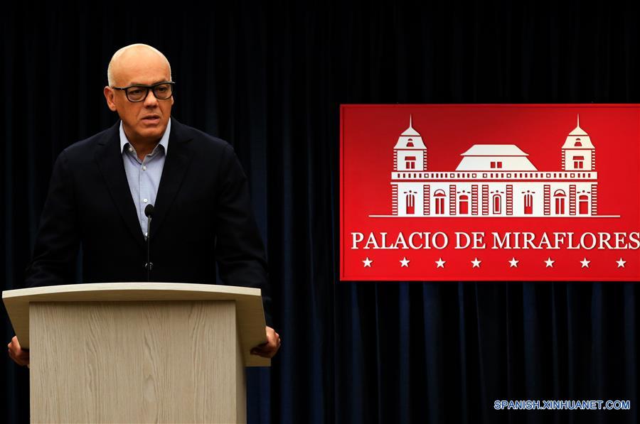 Imagen cedida por la Presidencia de Venezuela, del ministro venezolano de Comunicación, Jorge Rodríguez, ofreciendo declaraciones desde el Palacio de Miraflores, en Caracas, capital de Venezuela, el 26 de mayo de 2018. El ministro venezolano de Comunicación, Jorge Rodríguez, informó el sábado que el poder judicial de Venezuela dio "el correspondiente beneficio de libertad" al ciudadano estadounidense Joshua Holt y su esposa, quienes se encontraban detenidos y procesados por espionaje y porte ilícito de armas de guerra en Venezuela. (Xinhua/Presidencia de Venezuela)