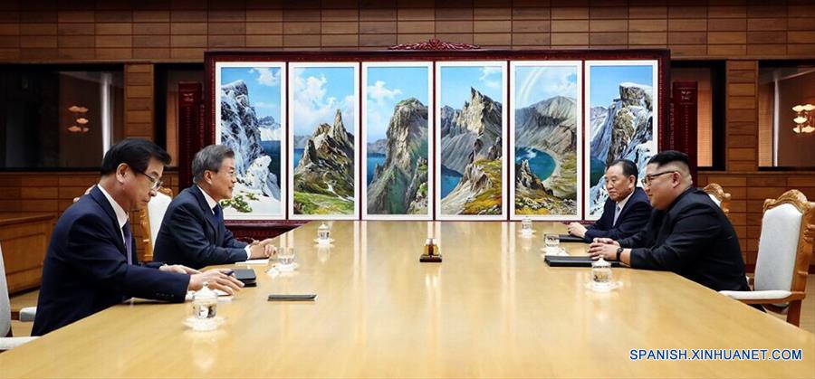 El presidente de República de Corea, Moon Jae-in (2-i), y el máximo líder de República Popular Democrática de Corea (RPDC), Kim Jong Un (d), sostienen su segundo encuentro en la aldea de la tregua de Panmunjom del lado de RPDC, el 26 de mayo de 2018. (Xinhua/Casa Azul)
