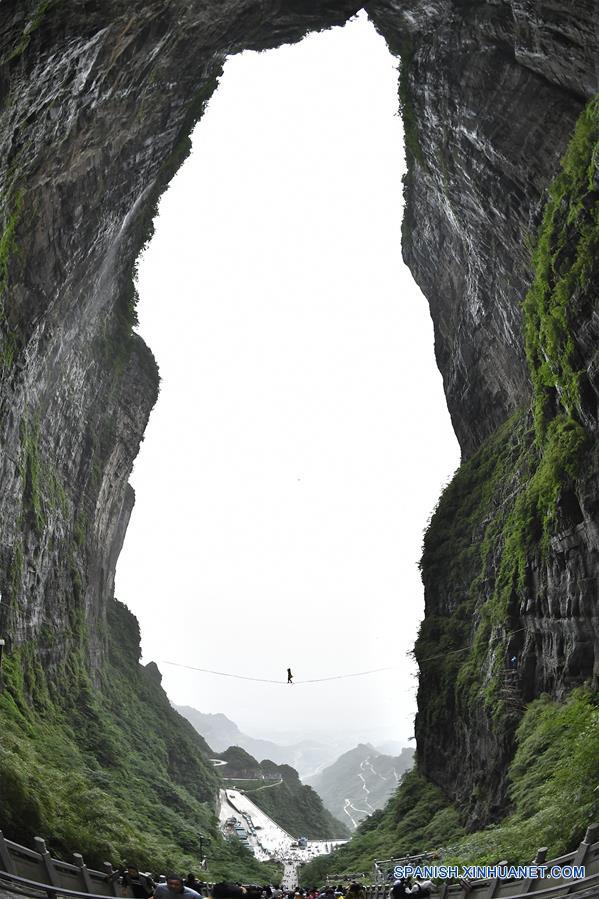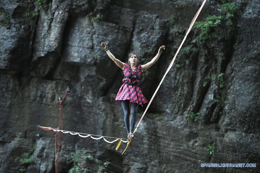 HUNAN, mayo 27, 2018 (Xinhua) -- Mia Noblet, de Canadá, participa en un concurso de "Slackline" o caminata sobre cuerda en tacones en Zhangjiajie, provincia central de Hunan, en China, el 27 de mayo de 2018. (Xinhua/Shao Ying)