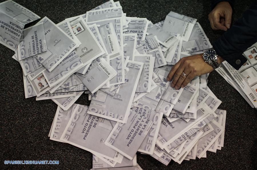 BOGOTA, mayo 27, 2018 (Xinhua) -- Un jurado de votación participa en el conteo de votos, en el centro más grande de votación Corferias, en Bogotá, Colombia, el 27 de mayo de 2018. El candidato del partido Centro Democrático, Iván Duque, y el del movimiento Colombia Humana, Gustavo Petro, disputarán la segunda vuelta de elecciones presidenciales en Colombia, según informes de la Registraduría Nacional del Estado Civil. Con el 99,46 por ciento de las mesas informadas, Duque obtiene 7.539.930 votos, o el 39,11 por ciento, mientras que Petro recibe 4.838.639 votos, o el 25,10 por ciento.(Xinhua/Jhon Paz)