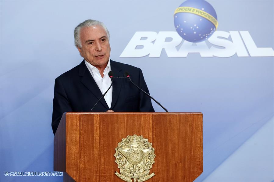 BRASILIA, mayo 27, 2018 (Xinhua) -- Imagen cedida por la Presidencia de Brasil del presidente brasile?o, Michel Temer, pronunciando un discurso en Brasilia, Brasil, el 27 de mayo de 2018. El presidente de Brasil, Michel Temer, anunció el domingo una reducción de 0,46 reales (0,12 dólares estadounidenses) en el precio del litro del diésel durante los próximos 60 días, con la intención de apaciguar así la huelga que desde el lunes pasado mantienen miles de camioneros en todo el país por el aumento de los precios de los combustibles. En un pronunciamiento en televisión la noche del domingo, Temer aseguró que después de los 60 días, el diésel tendrá apenas reajustes mensuales, y no diarios como ahora, para dar "previsibilidad" a los conductores. (Xinhua/Alan Santos/Presidencia de Brasil)