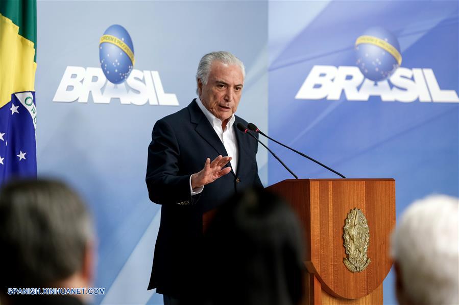 BRASILIA, mayo 27, 2018 (Xinhua) -- Imagen cedida por la Presidencia de Brasil del presidente brasile?o, Michel Temer, pronunciando un discurso en Brasilia, Brasil, el 27 de mayo de 2018. El presidente de Brasil, Michel Temer, anunció el domingo una reducción de 0,46 reales (0,12 dólares estadounidenses) en el precio del litro del diésel durante los próximos 60 días, con la intención de apaciguar así la huelga que desde el lunes pasado mantienen miles de camioneros en todo el país por el aumento de los precios de los combustibles. En un pronunciamiento en televisión la noche del domingo, Temer aseguró que después de los 60 días, el diésel tendrá apenas reajustes mensuales, y no diarios como ahora, para dar "previsibilidad" a los conductores. (Xinhua/Alan Santos/Presidencia de Brasil)
