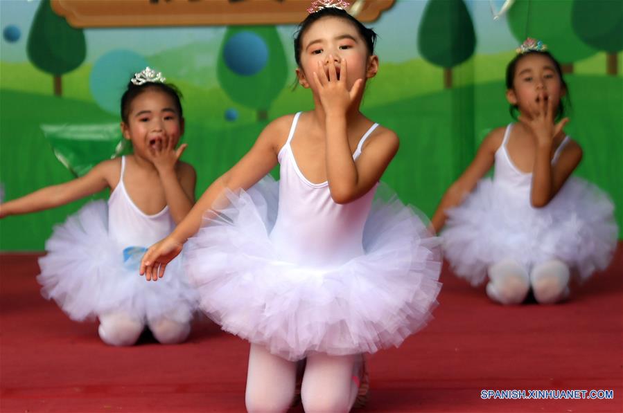 Imagen del 27 de mayo de 2018 de ni?as realizando una danza en una base de entrenamiento artístico para celebrar el Día del Ni?o, en el distrito de Qinbei, en la ciudad de Qinzhou, en la Región Autónoma Zhuang de Guangxi, en el sur de China. (Xinhua/Zhang Ailin)