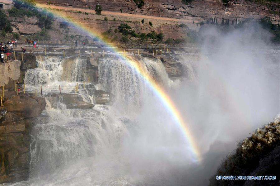 SHANXI, mayo 28, 2018 (Xinhua) -- Imagen del 27 de mayo de 2018 de turistas observando la Catarata de Hukou del Río Amarillo, en el condado de Jixian, provincia de Shanxi, en el norte de China. (Xinhua/Lyu Guiming)