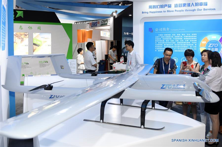 Visitantes observan un dron en la 5 Feria Internacional de Comercio de Servicios de Beijing de China, en Beijing, capital de China, el 28 de mayo de 2018. La feria inició el lunes y cerrará el 1 de junio. Más de 130 seminarios, reuniones y actividades de comercio han sido planeadas para la feria. (Xinhua/Zhang Chenlin)