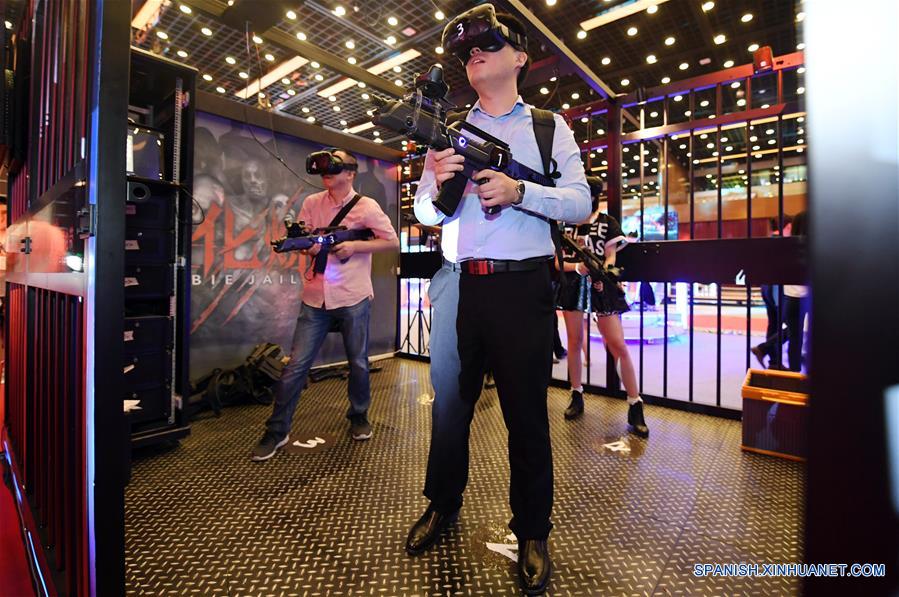 Visitantes prueban un juego de realidad virtual en la 5 Feria Internacional de Comercio de Servicios de Beijing de China, en Beijing, capital de China, el 28 de mayo de 2018. La feria inició el lunes y cerrará el 1 de junio. Más de 130 seminarios, reuniones y actividades de comercio han sido planeadas para la feria. (Xinhua/Zhang Chenlin)