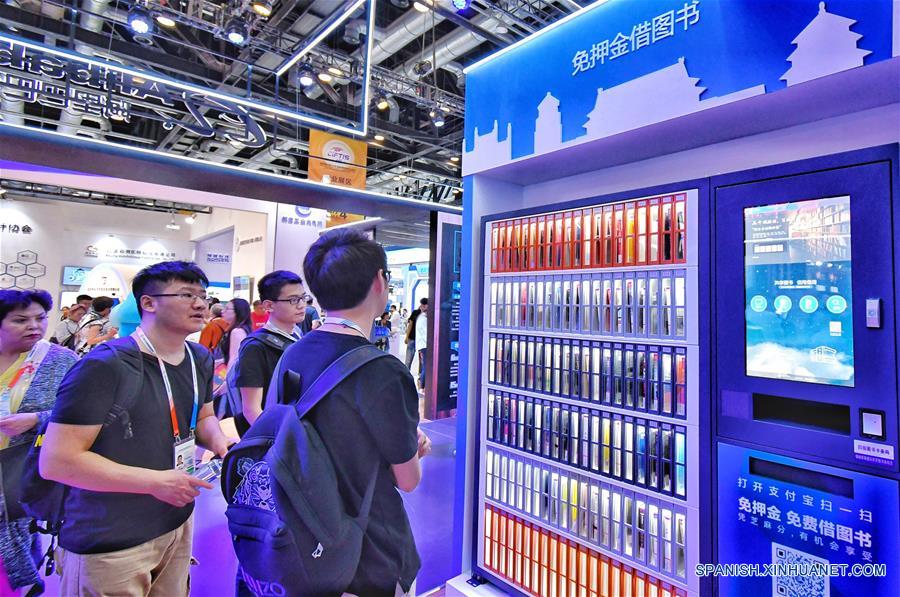 Visitantes observan una librería de autoservicio en la 5 Feria Internacional de Comercio de Servicios de Beijing de China, en Beijing, capital de China, el 28 de mayo de 2018. La feria inició el lunes y cerrará el 1 de junio. Más de 130 seminarios, reuniones y actividades de comercio han sido planeadas para la feria. (Xinhua/Li Xin)