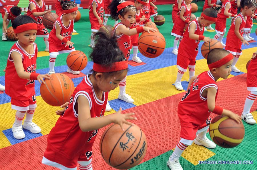 Un grupo de ni?os juega baloncesto durante un actividad llevada a cabo en un jardín de ni?os, en el condado de Jishan, Yuncheng, provincia de Shanxi, en el norte de China, el 29 de mayo de 2018. Varias actividades fueron llevadas a cabo a través de China para celebrar el próximo Día Internacional del ni?o. (Xinhua/Li Lujian)