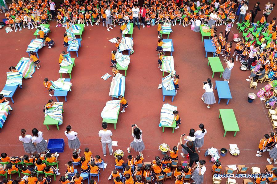 Ni?os participan en un concurso de doblado de colchas en un jardín de ni?os, en Huaying, provincia de Sichuan, en el suroeste de China, el 29 de mayo de 2018. Varias actividades fueron llevadas a cabo a través de China para celebrar el próximo Día Internacional del Ni?o. (Xinhua/Qiu Haiying)