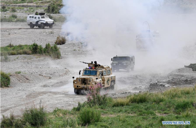 Los vehículos blindados se movilizan durante un ejercicio antiterrorista conjunto celebrado por las fuerzas fronterizas de China y Kirguistán en la prefectura de Kizilsu Kirgiz, en la región autónoma Uygur de Xinjiang, noroeste de China, el 27 de junio de 2017. La XVII Cumbre de la Organización de Cooperación de Shanghai (OCS) está programada del 9 al 10 de junio en Qingdao, una ciudad costera de la provincia de Shandong, este de China. Desde que China asumió la presidencia rotatoria de la OCS en junio pasado, hasta la fecha se han llevado a cabo más de 160 actividades, incluyendo una serie de importantes reuniones institucionales y eventos multilaterales. (Xinhua / Ju Zhenhua)