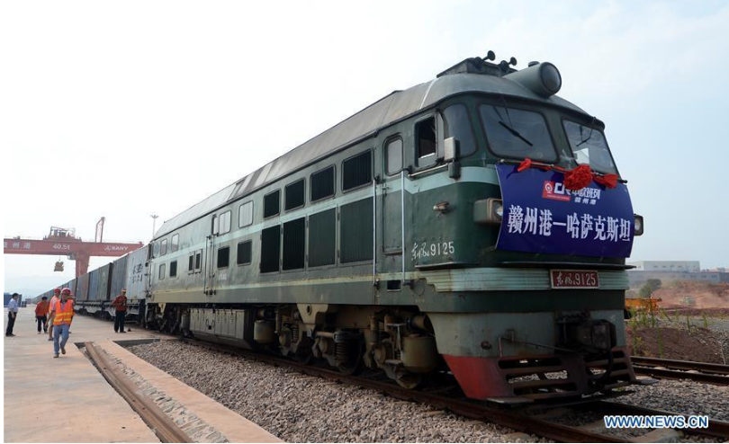 Un tren de carga sale para Kazajistán desde Ganzhou, provincia de Jiangxi, este de China, el 27 de julio de 2017. La XVII Cumbre de la Organización de Cooperación de Shanghai (OCS) está programada del 9 al 10 de junio en Qingdao, una ciudad costera de la provincia de Shandong, este de China. Desde que China asumió la presidencia rotatoria de la OCS en junio pasado, hasta la fecha se han llevado a cabo más de 160 actividades, incluyendo una serie de importantes reuniones institucionales y eventos multilaterales. (Xinhua / Ju Zhenhua)
