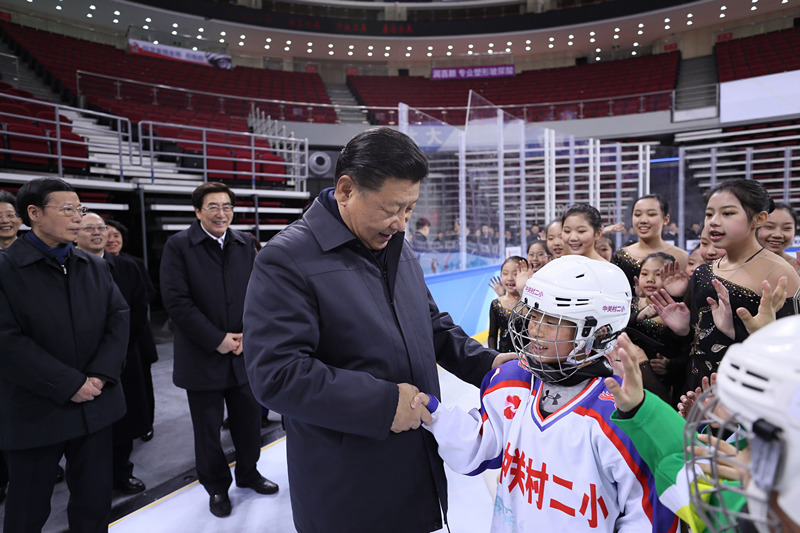 El presidente Xi Jinping saluda a un ni?o del equipo de hockey sobre hielo de la Segunda Escuela Primaria de Zhongguancun en el estadio de hockey sobre hielo para los Juegos Olímpicos 2022 en el Centro de Deportes de Wukesong, Beijing, el 24 de febrero de 2017. [Foto / people.com.cn]