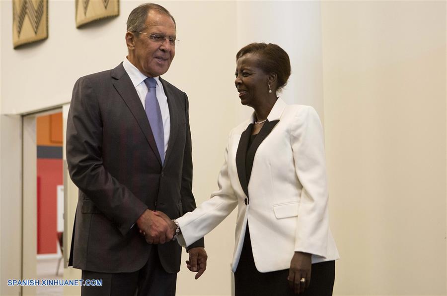 KIGALI, junio 3, 2018 (Xinhua) -- El ministro de Relaciones Exteriores de Rusia, Sergey Lavrov (i) estrecha la mano de su homóloga de Rwanda, Louise Mushikiwabo (d) en Kigali, Rwanda, el 3 de junio de 2018. El ministro de Relaciones Exteriores de Rusia, Sergey Lavrov, llegó el domingo por la ma?ana a la capital ruandesa Kigali para realizar una visita oficial de un día con el fin de reforzar la relación bilateral. (Xinhua/Gabriel Dusabe)