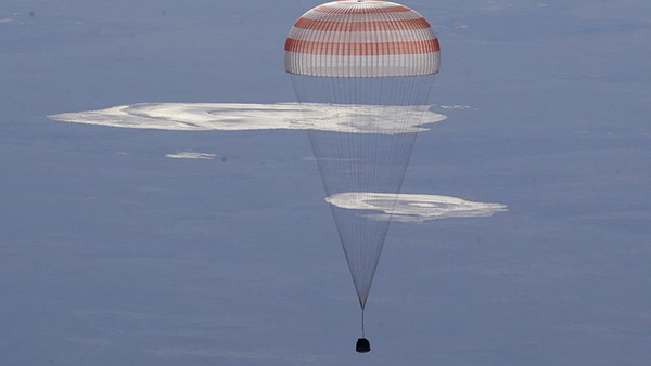 La nave Soyuz, en el momento de aterrizar (Dmitri Lovetsky / AP)