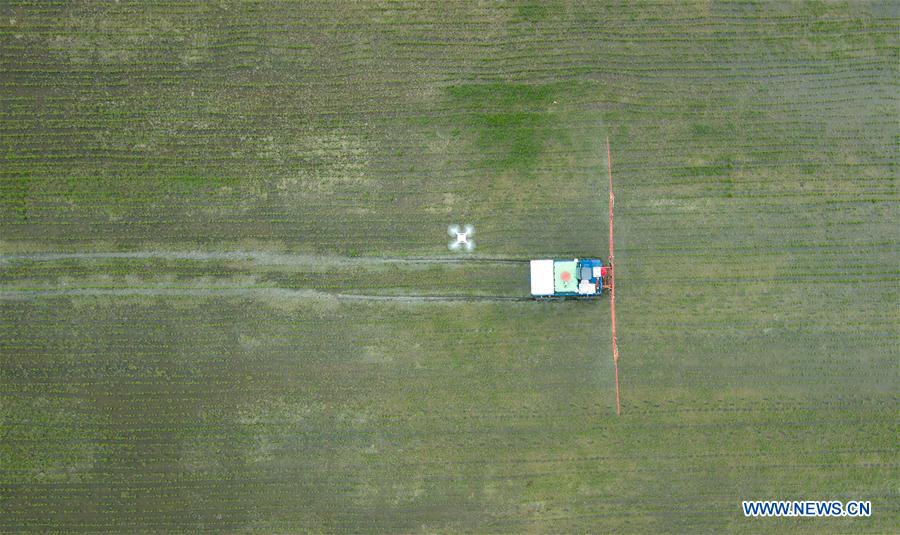 En esta foto aérea tomada el 2 de junio del 2018, como parte de una demostración experimental de procesos de producción agrícola que incorporan tecnología de punta, una atomizadora-cosechadora no tripulada trabaja en un campo de arroz en Xinghua, provincia de Jiangsu, China. [Foto: Xinhua]