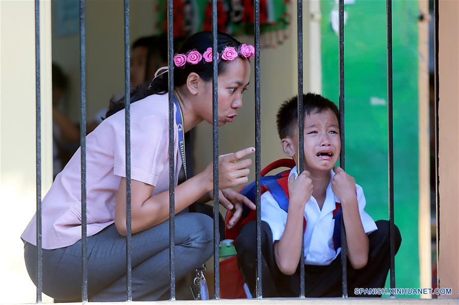 Un ni?o llora durante el primer día de clases, en la Escuela Primaria Presidente Corazon C. Aquino, en la ciudad de Quezón, Filipinas, el 4 de junio de 2018. (Xinhua/Rouelle Umali)