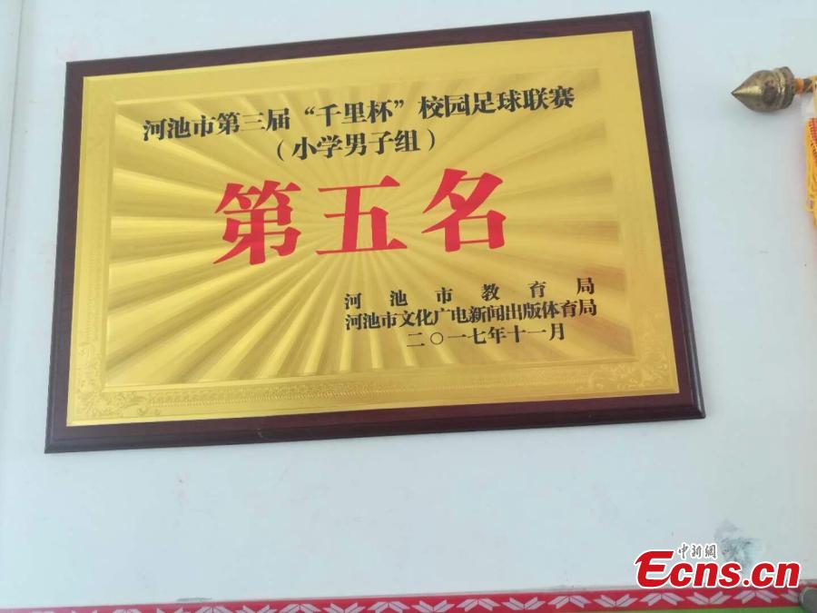 Placa acreditativa del quinto lugar logrado en el 2017 por el equipo de fútbol masculino de la escuela primaria en el campeonato de la ciudad Hechi, región autónoma Guangxi Zhuang. Esta comarca monta?osa tiene una población de 400.000 habitantes y es una de las zonas más pobres de la región. (Foto: China News Service/ Jiang Xuelin)