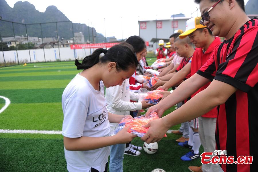 Voluntarios de un proyecto de construcción de una carretera donan uniformes a la escuela primaria del pueblo Liuye, condado autónomo Yao Dahua, región autónoma Guangxi Zhuang. Esta comarca monta?osa tiene una población de 400.000 habitantes y es una de las zonas más pobres de la región. (Foto: China News Service/ Jiang Xuelin)
