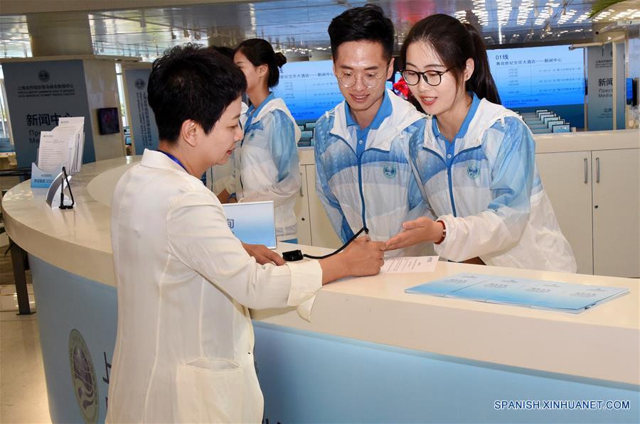 Imagen del 3 de junio de 2018 de voluntarios ayudando a un invitado en el centro de medios de la Cumbre de la Organización de Cooperación de Shanghai (OCS), en Qingdao, en la provincia de Shandong, en el este de China. El centro de medios abrirá el 6 de junio, de acuerdo a su agenda. Un total de 370 voluntarios de cuatro universidades en Qingdao han permanecido en sus puestos después de tres meses de entrenamiento. (Xinhua/Li Ziheng)