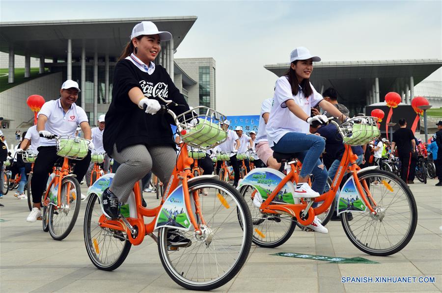 Voluntarios transitan en bicicletas durante una actividad llevada a cabo para llamar la atención acerca de los viajes ecológicos, en Hohhot, capital de la Región Autónoma de Mongolia Interior, en el norte de Chhina, el 5 de junio de 2018. El Día Mundial del medio Ambiente se celebra el 5 de junio. (Xinhua/Zou Yu)
