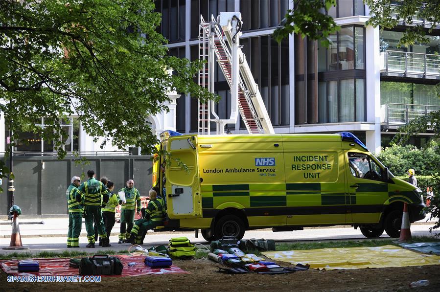 Empleados del SErvicio de Ambulancias de Londres, trabajan en la escena después de un incendio en el Mandarin Oriental Hotel, en Knightsbridge, Londres, Reino Unido, el 6 de junio de 2018. (Xinhua/Stephen Chung)