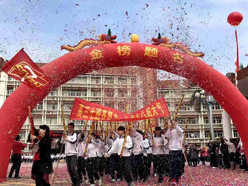 Los estudiantes participan en un evento de animación relacionado con el Gaokao en la escuela secundaria Boluo, Huizhou, provincia de Guangdong, 6 de junio del 2018. [Foto: Lin Jiefeng]