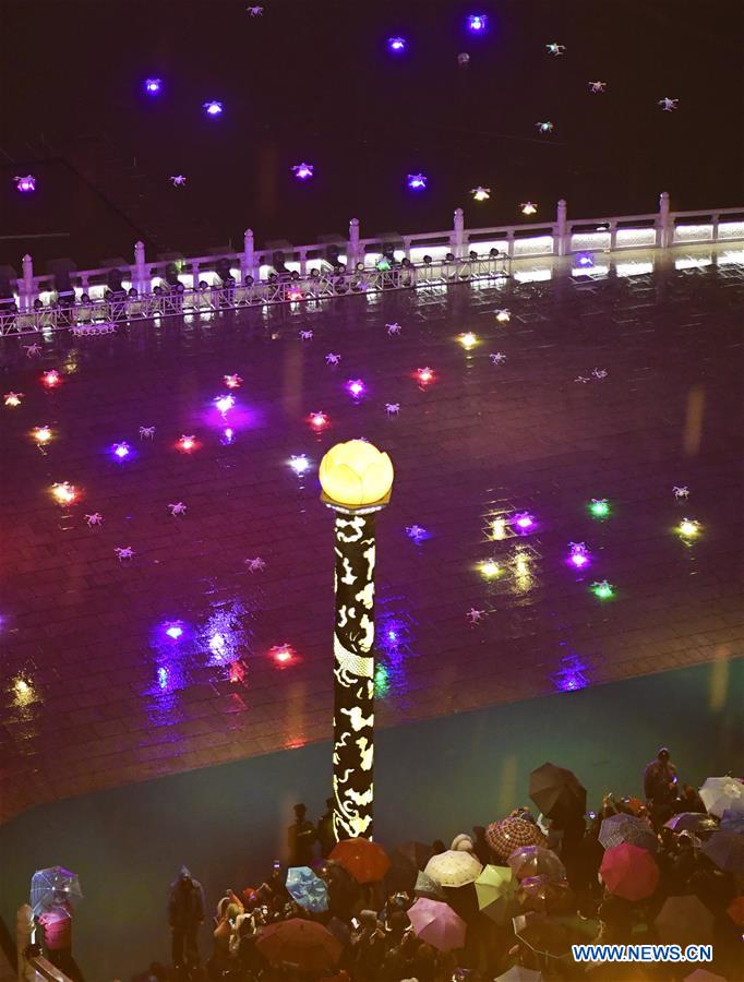 Una flota de vehículos aéreos no tripulados parquean durante la noche en Xi'an, capital de Shaanxi, 20 de febrero del 2018. En los últimos a?os, los vehículos aéreos no tripulados se integran a la vida cotidiana de toda China, ya sea en la agricultura, el transporte o en la industria del entretenimiento. También muchos sectores se apoyan en los vehículos aéreos no tripulados para tomar fotografías aéreas, realizar labores de salvamento y auxilio, vigilar las cosechas y realizar entregas rápidas de productos. La amplia utilización de los vehículos aéreos no tripulados no sólo hace la vida más sencilla y cómoda, también amplía la imaginación del pueblo chino hacia el futuro. (Foto: Xinhua/ Shao Rui)